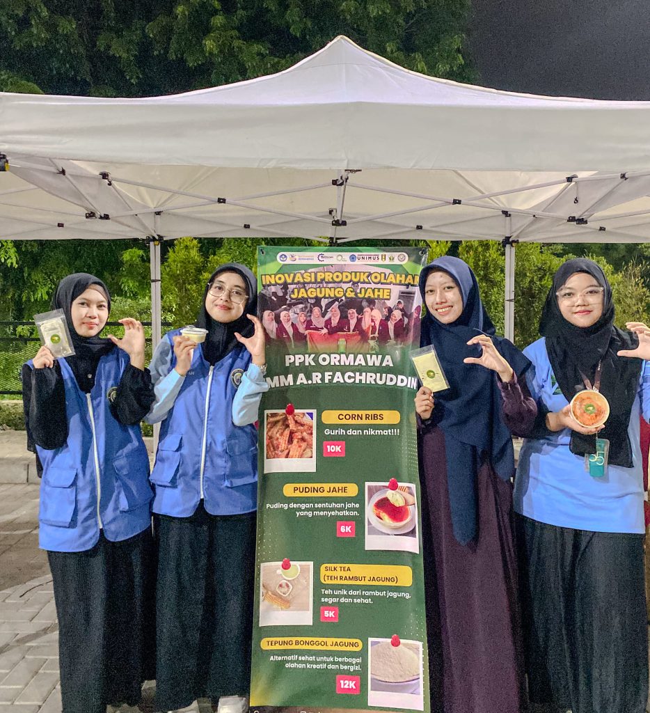 Stand PPK IMM AR Fachruddin menampilkan empat produk hasil pelatihan dan pendampingan masyarakat Desa Jamus, yakni corn rib, corn flour, silk tea, dan puding jahe. Selain memperkenalkan produk, kegiatan ini juga bertujuan untuk memperluas promosi, menguji respon pasar, serta menjalin relasi baru dengan pengunjung.